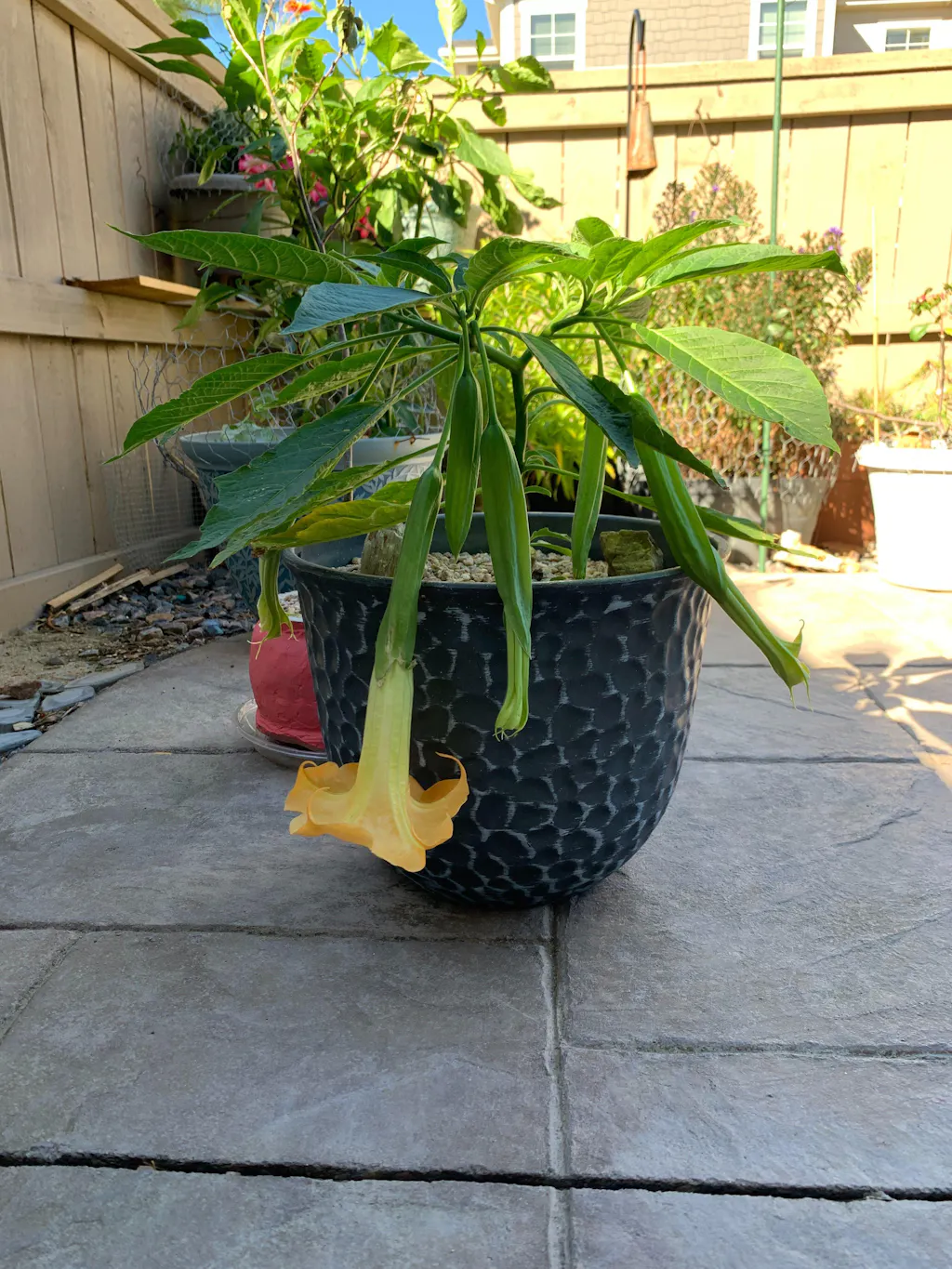 Brugmansia ‘Angel’s Summer Dream’ is a new, Logee’s exclusive hybrid that starts blooming at only 12" tall. This dwarf variety, created by horticulturist and owner, Byron Martin, has prolific, fragrant blooms year-round. The full-size, 5-6” long, orange-yellow flowers have tones of deep orange when fully mature. A delightful nighttime scent fills the air with sweet perfume. Similar to Brugmansia ‘Inca Sun’, ‘Angel’s Summer Dream’ will flower continuously throughout the growing season from shoots and spurs. The lateral branching habit makes it perfect for containers or hanging baskets. This award-winning plant will be one of your favorites!
