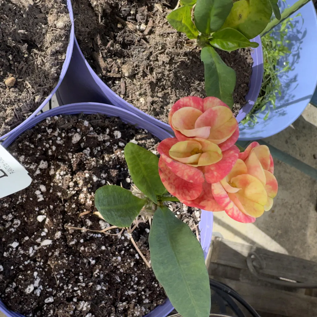 Like the magnificence of the setting sun, Crown of Thorns ‘Sunset Splendor’ has radiant hues of light and dark orange to captivate all who see it. The large 1-2” flowers often grow as doubles if the plant is in favorable conditions. It thrives on a sunny windowsill or grow it outside during the warm summer months. Euphorbias are indestructible houseplants. Be sure to let the soil dry out between waterings.