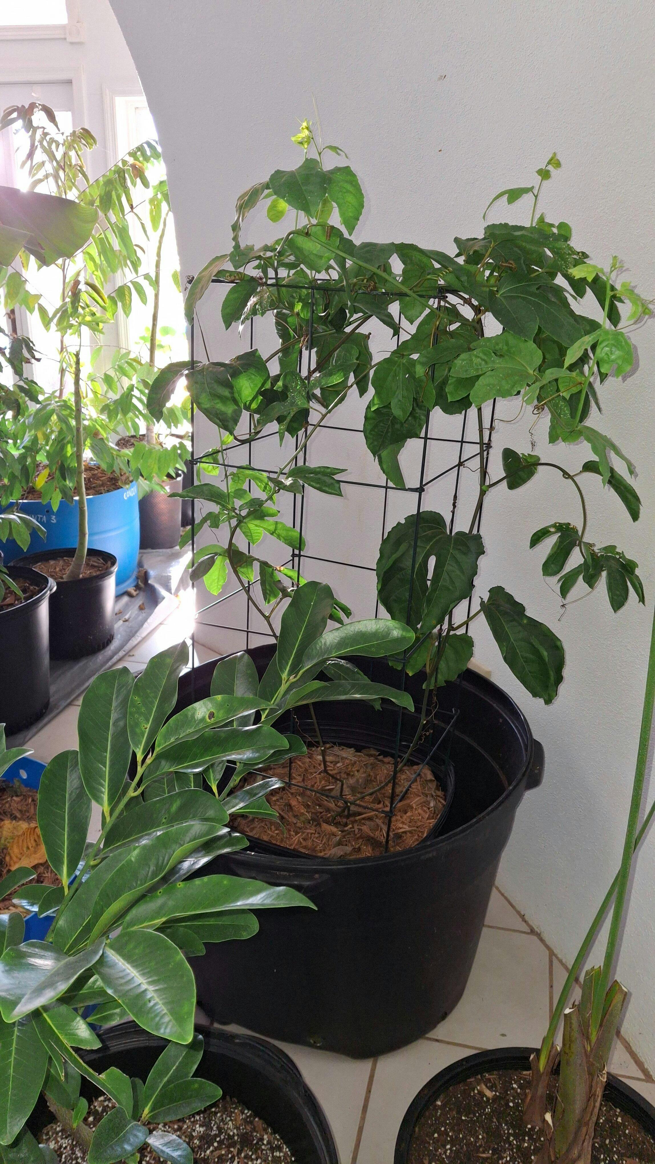 One-third larger than the regular passion fruit, ‘Panama’ is a strong grower and it produces extra large, delicious fruit that can be eaten fresh or made into juice. The fruit is reddish-purple on the outside and white on the inside with golden colored custard-like edible pulp. This self-fertile, fruiting variety has good resistance to root rot. The lovely flowers have white petals and frilly purple-to-white filaments. Once the flowers arrive, it’s a sign that the late summer fruit will soon follow. If flowering indoors, hand pollination will help with fruit set.