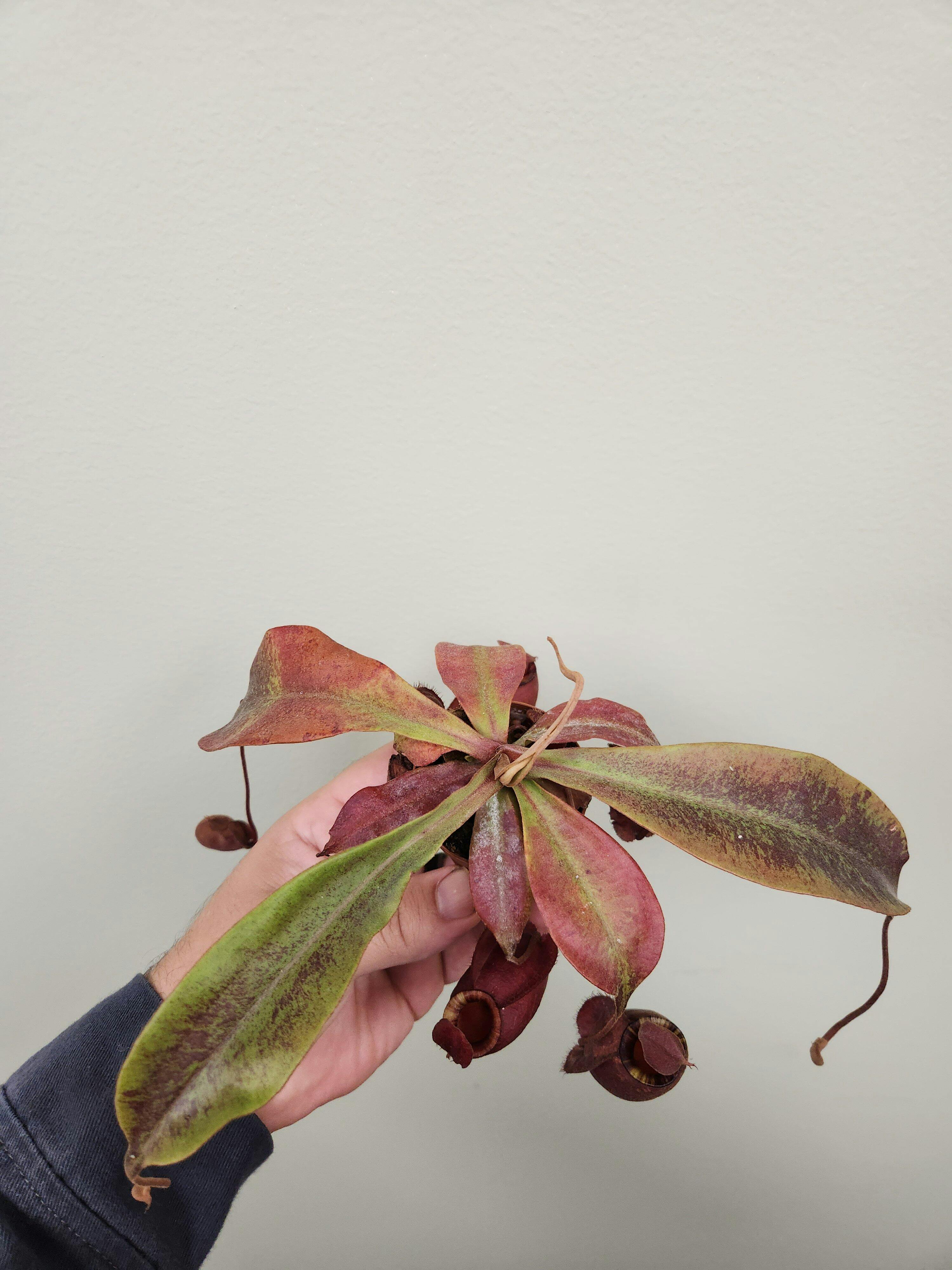 Nepenthes 'Black Miracle' is a standout addition to any carnivorous plant collection. It produces compact, dark pitchers with deep red to nearly black tones. The top of each pitcher is ribbed and often boldly striped complimenting the maroon-speckled leaves. It’s best to use rainwater or distilled water and no fertilizer to keep this plant healthy. Whether you grow it in a terrarium, greenhouse, or a bright indoor spot, ‘Black Miracle’ brings a bold presence that’s hard to ignore.
